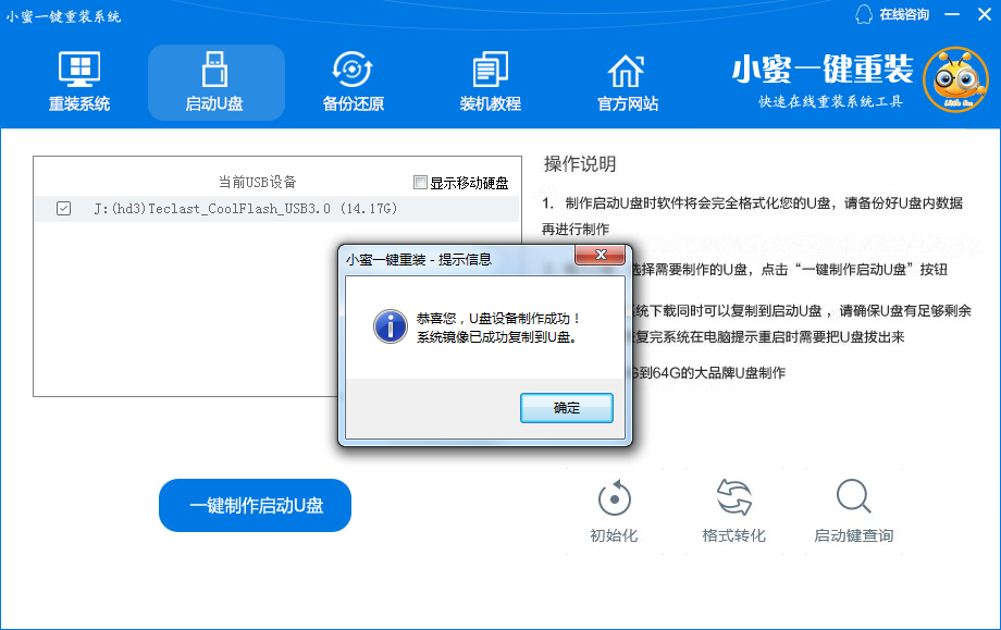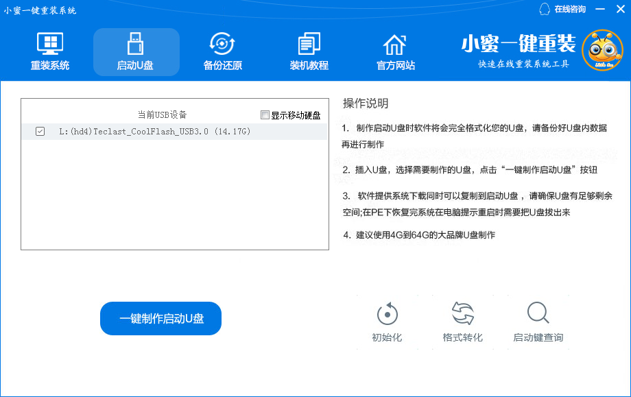 检测U盘是否正确插入(下图为插入)。同时请退出杀毒软件防止U盘被占用,最好选择性能较好,内存≥8G的U盘,确认插入后,点击“初始化”,然后点击“一键制作启动U盘”。