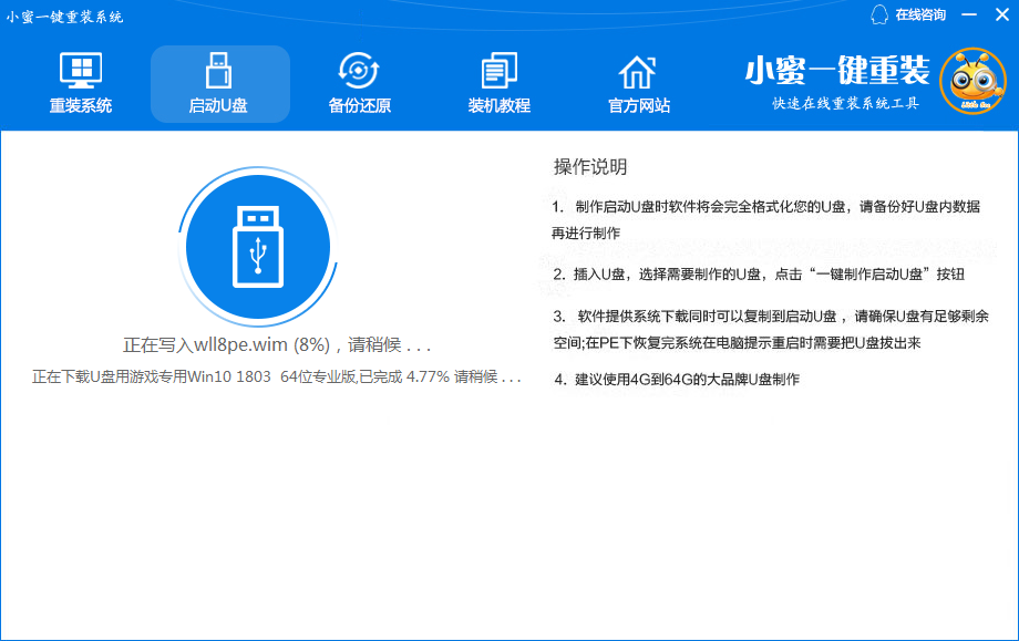 自动下载并制作启动U盘,此过程需要在线下载,根据网速,整个过程可能要几分钟或者几十分钟,请耐心等待。