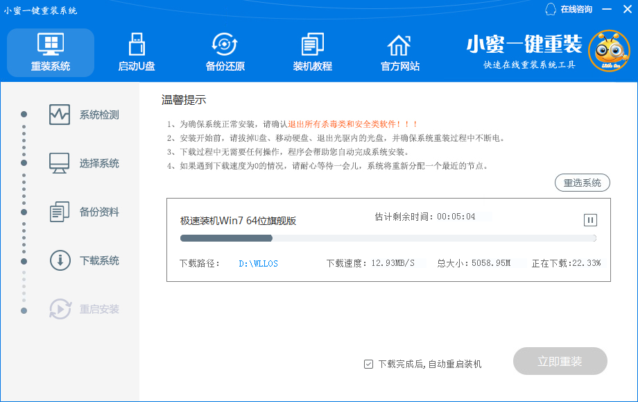 下载系统。下载用户选择的系统,重装系统的最后一步。到了这一步用户就可以离开电脑,程序会全自动完成重装,为防止出现失败,同时也可以去“制作启动U盘”。